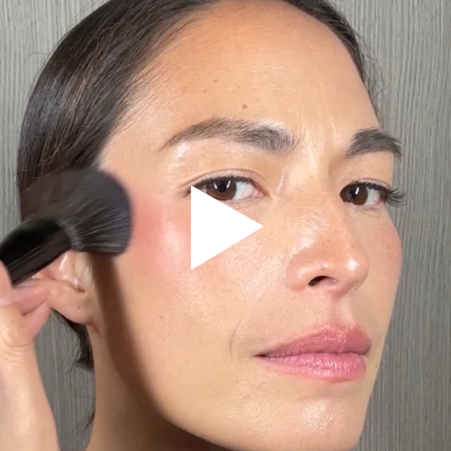 - Für einen nahtlosen Farbakzent schichte zwei Blush-Farbnuancen übereinander. Beginne mit einer Grundfarbe in einem Farbton, der den Wangen eine dezente Rötung verleiht. Trage eine hellere in einem ähnlichen Farbton auf die Wangen auf und verblende dann die Ränder, um die Grundfarbe zu verwischen.
